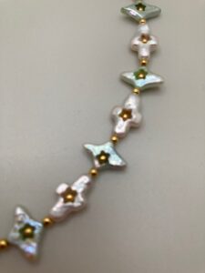 Single strand of white cross-shaped and dyed green diamond-shape freshwater cultured pearls. The diamond-shaped green pearls have center star shaped drill holes and are strung with yellow gold-plated beads, clasp, and earring findings. Earrings are included for free, a $60 value.